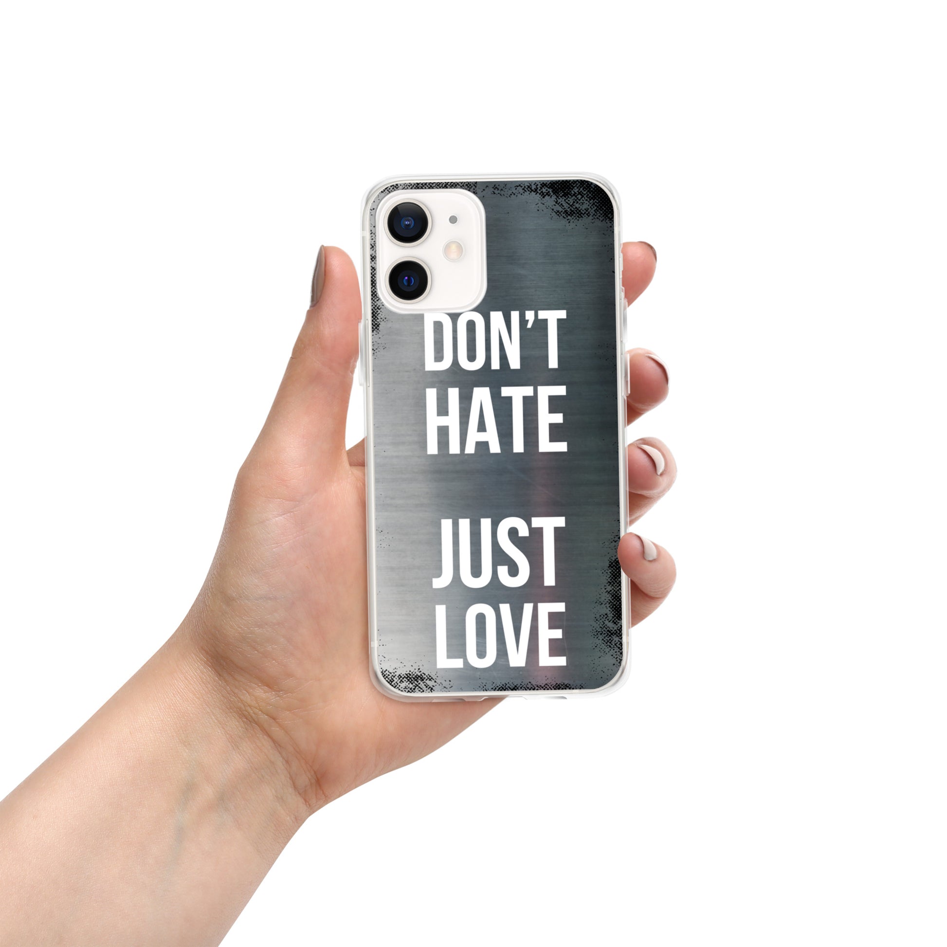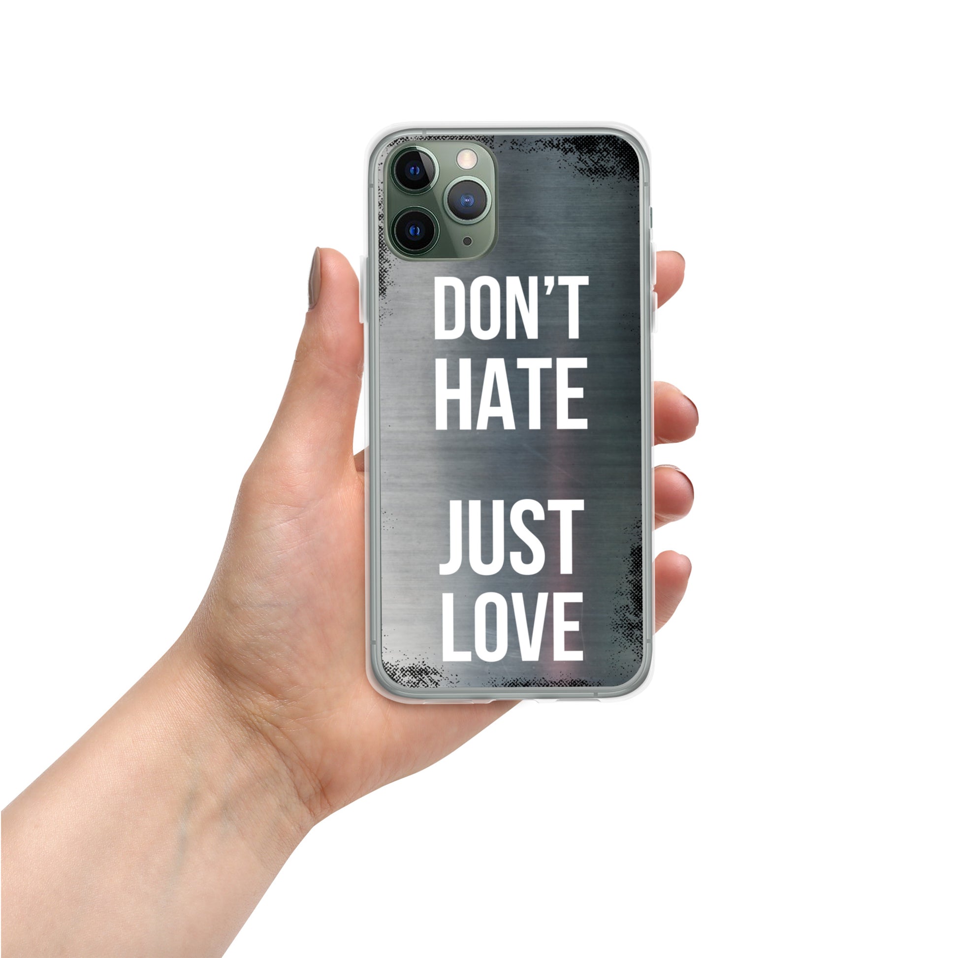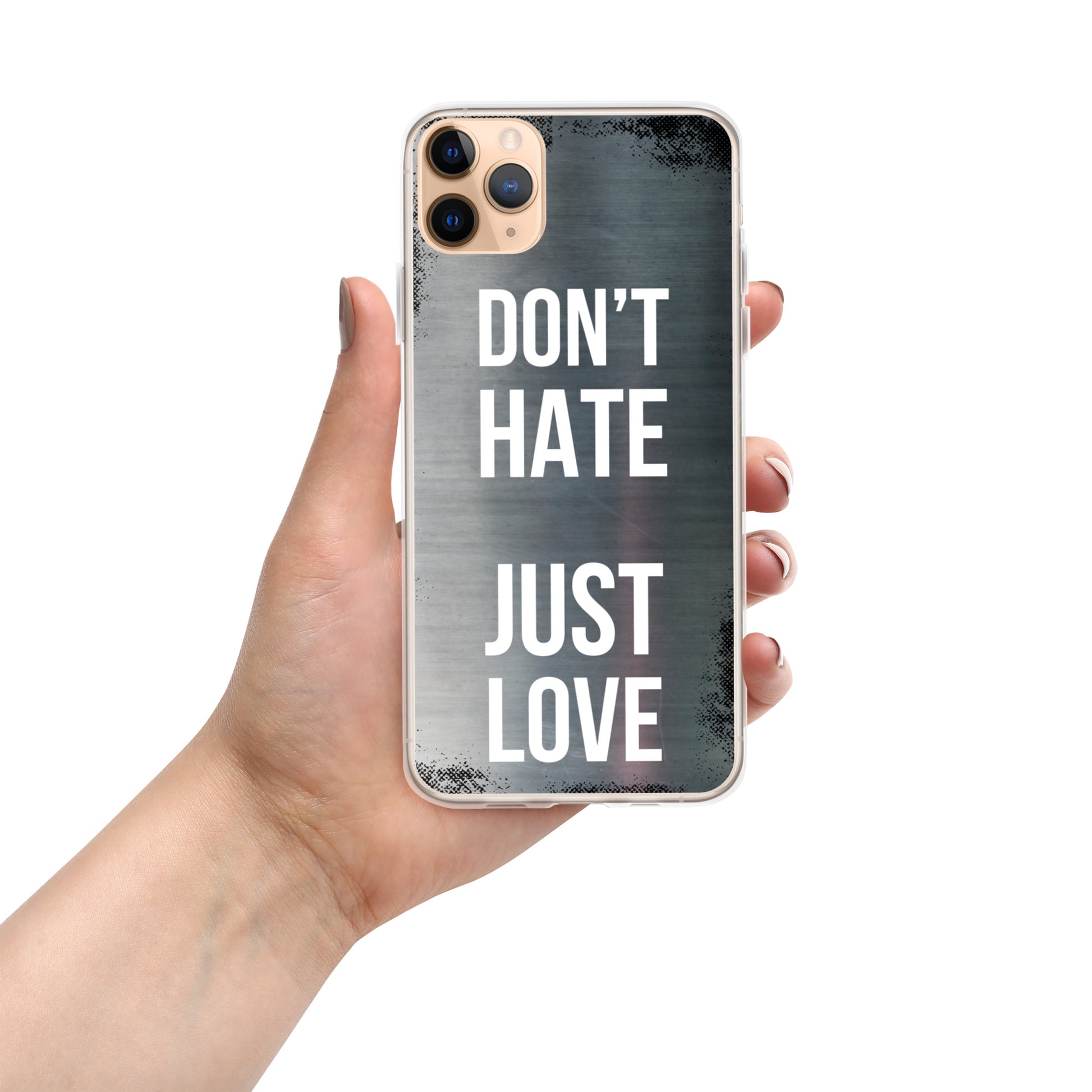 Spread the message of love and positivity with our "Don't Hate, Just Love" iPhone Case. Made with high-quality materials, this case not only protects your phone but also serves as a constant reminder to choose love over hate. The sleek black design features our signature "Just Love" logo in bold white letters, making a statement wherever you go. Plus, with every purchase, you're supporting a business that stands against bullying and promotes kindness. Choose love and get your "Don't Hate, Just Love" iPhone Case today.