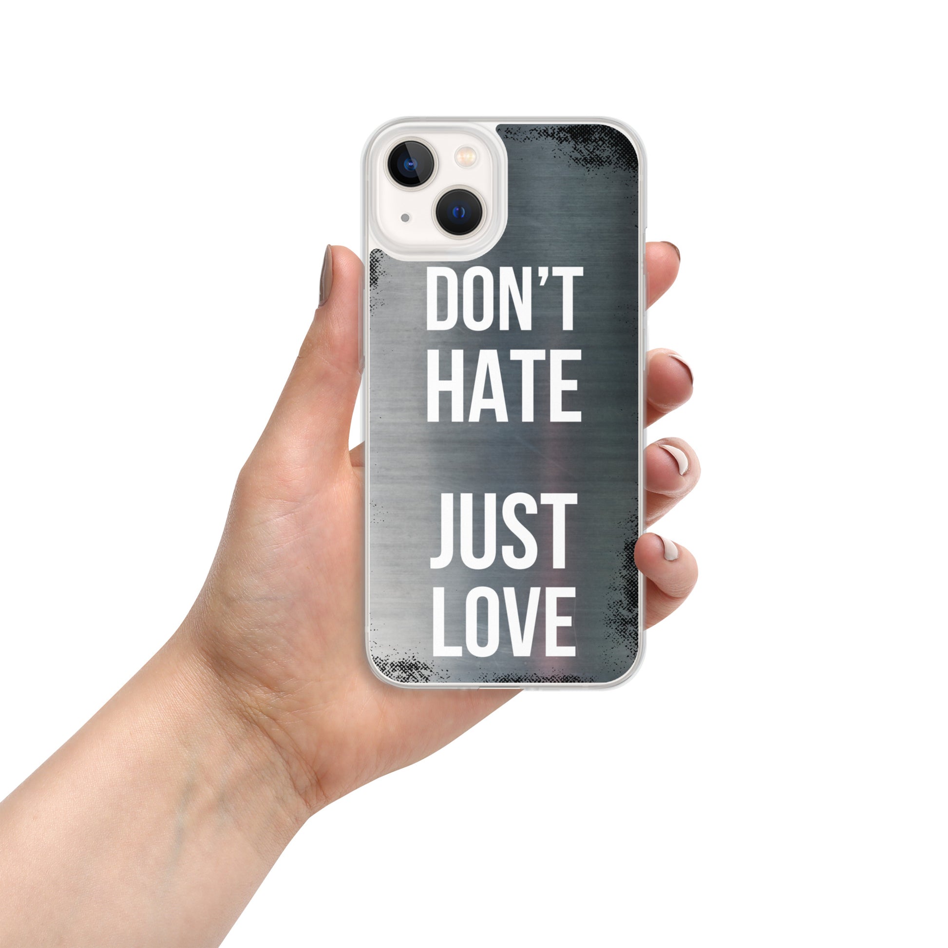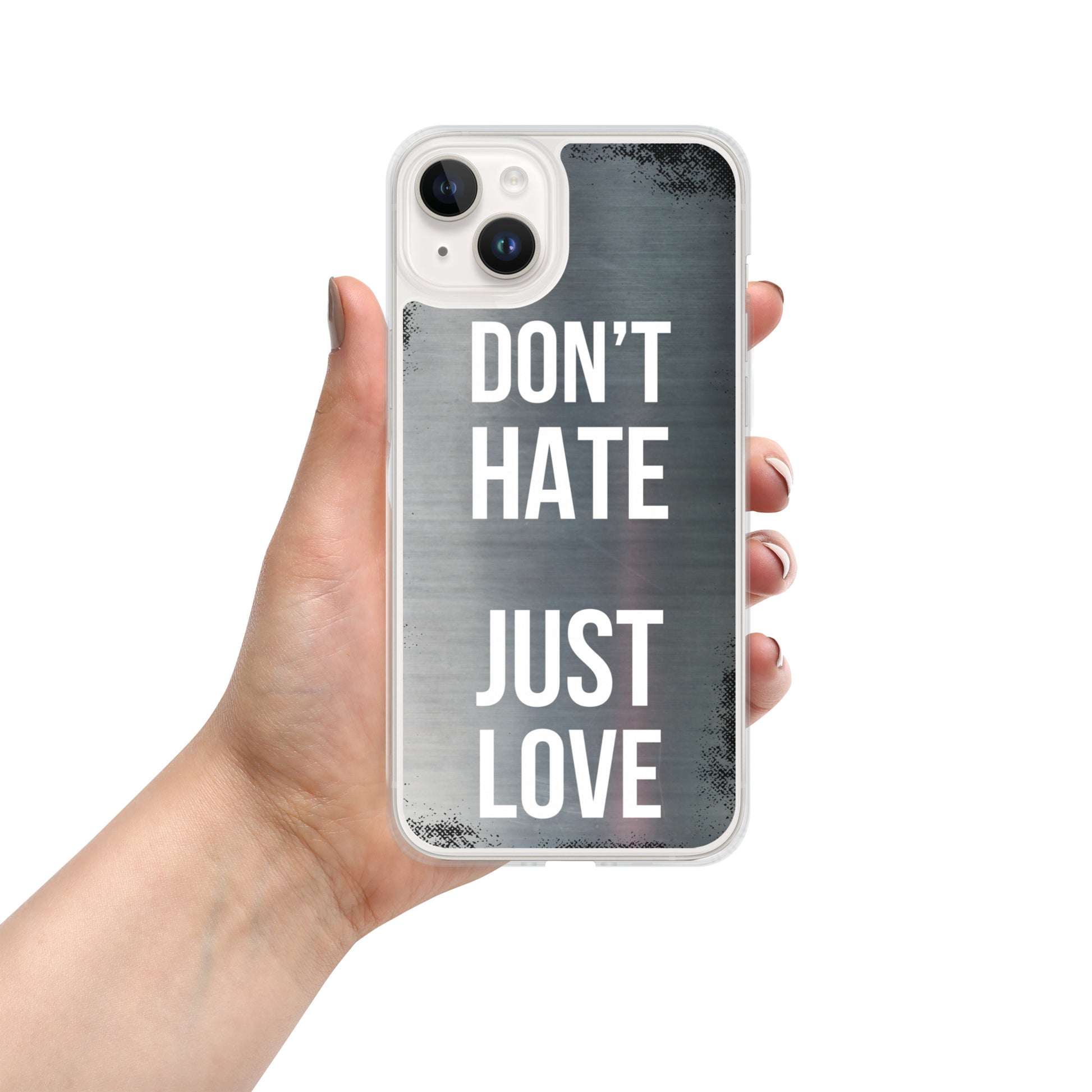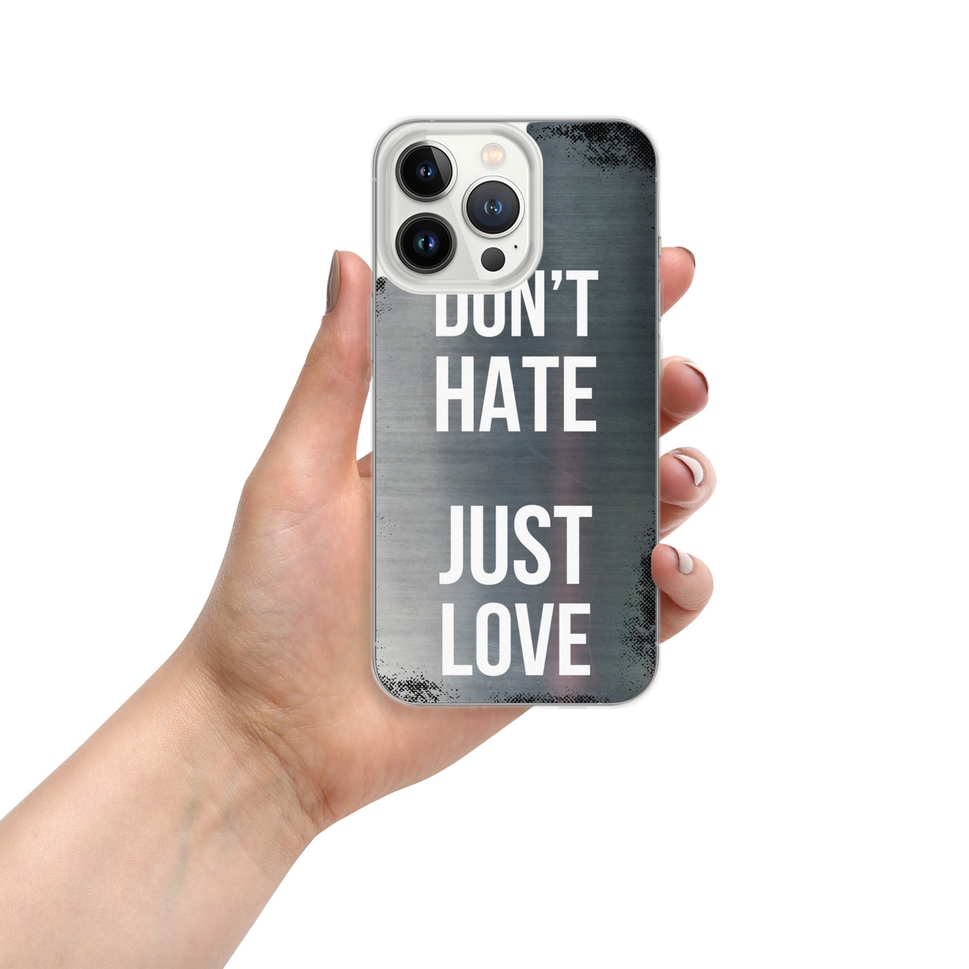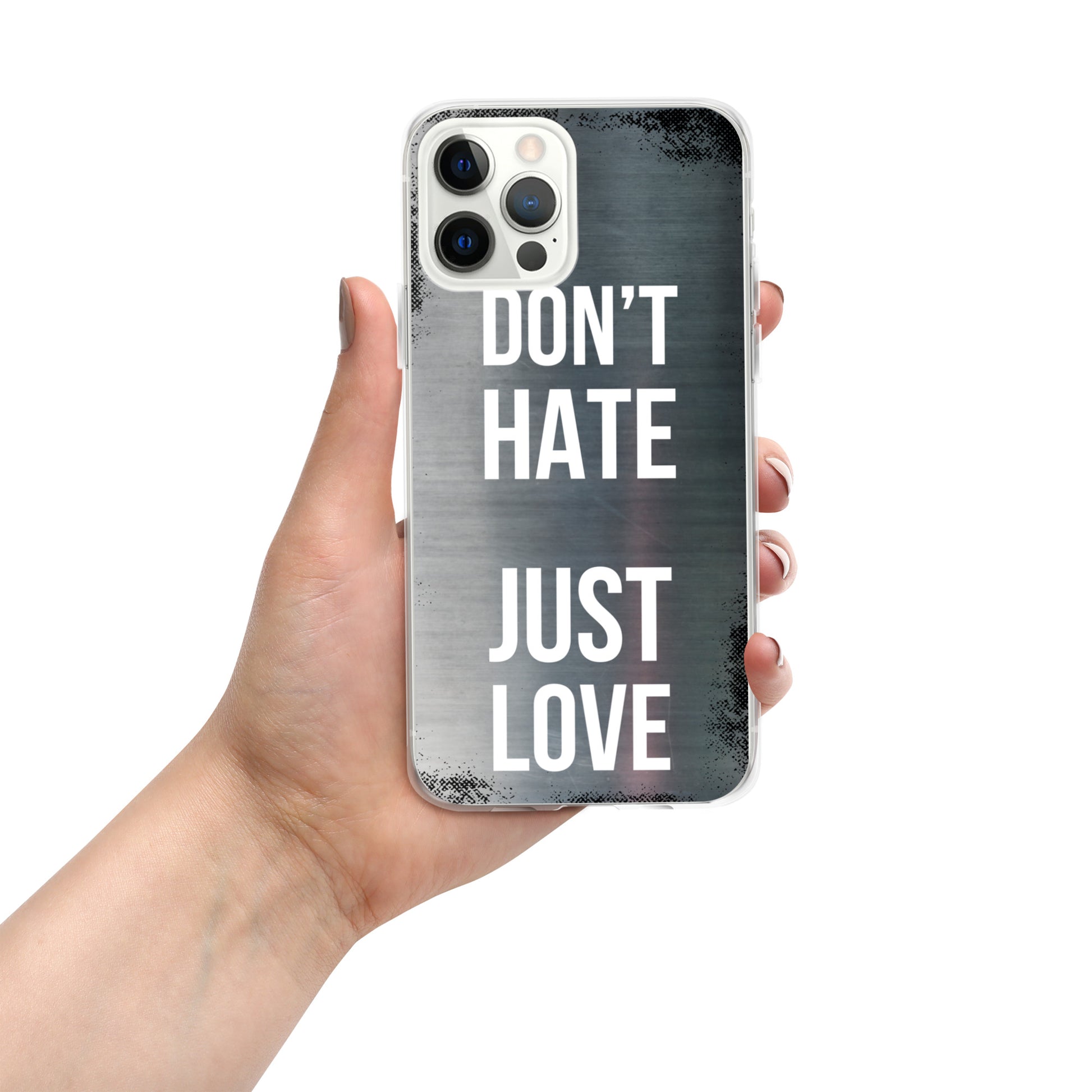 Spread the message of love and positivity with our "Don't Hate, Just Love" iPhone Case. Made with high-quality materials, this case not only protects your phone but also serves as a constant reminder to choose love over hate. The sleek black design features our signature "Just Love" logo in bold white letters, making a statement wherever you go. Plus, with every purchase, you're supporting a business that stands against bullying and promotes kindness. Choose love and get your "Don't Hate, Just Love" iPhone Case today.